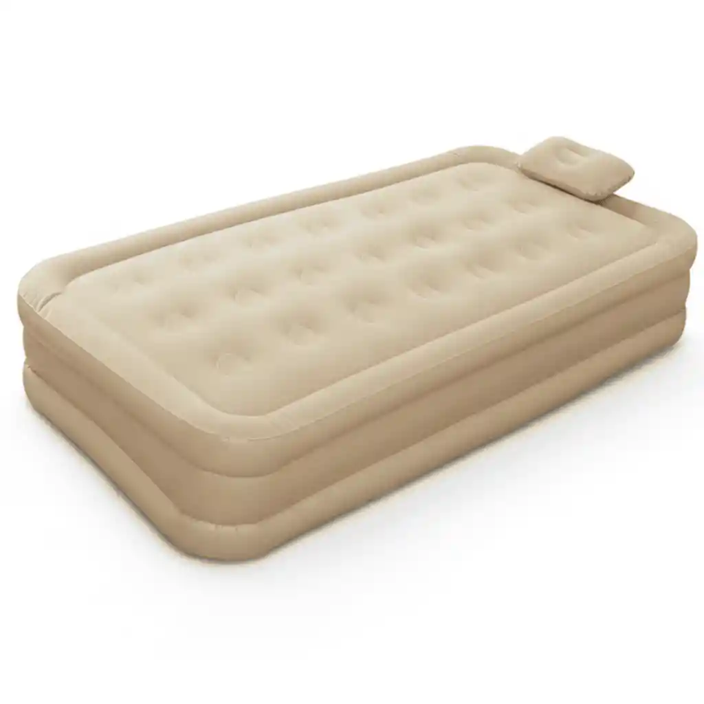 Comodidad portátil para viajes y escapadas Si disfrutas acampar o viajar, sabes que descansar bien cambia toda la experiencia. El colchón inflable H9021 combina firmeza, altura y practicidad para ofrecer un mejor soporte durante la noche. Su bomba integrada elimina complicaciones y reduce el tiempo de preparación. Ligero y fácil de transportar, es ideal para camping, fincas o estadías temporales. Una opción cómoda para quienes no quieren improvisar al dormir fuera de casa. Especificaciones Colchón inflable individual modelo H9021 fabricado en PVC resistente color beige, superficie superior texturizada acolchada, bomba eléctrica integrada, dimensiones 190 cm de largo x 100 cm de ancho x 40 cm de alto, válvula de seguridad reforzada, uso interior y exterior, medidas aproximadas del empaque 45 cm alto x 35 cm ancho x 20 cm largo, peso aproximado 6 kg. Incluye 1 colchón inflable individual con bomba incorporada. Garantía 30 días por defectos de fabricación. Política de Retracto 5 días hábiles desde la recepción del producto, siempre que esté completo y sin uso. Nota Importante Si el producto llega golpeado o con piezas faltantes, repórtalo en las primeras 24 horas a la transportadora. Para aplicar la garantía, envía fotos y videos donde se evidencie el defecto.