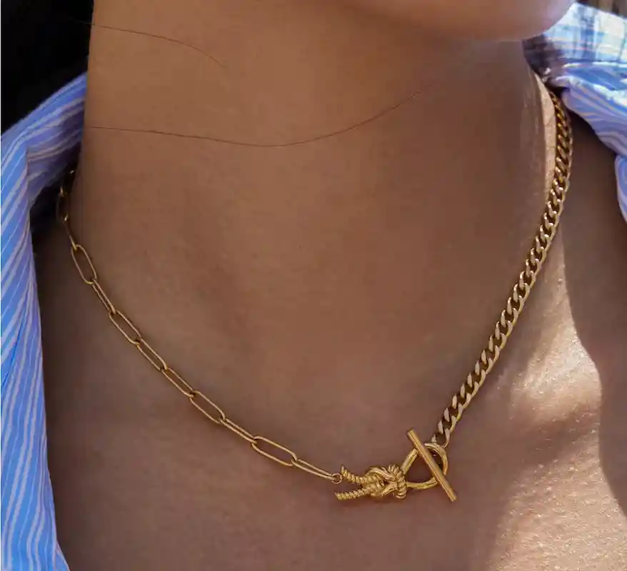 El Collar Céfira es una pieza con carácter y diseño contemporáneo. Su mezcla de eslabones dorados de distintos...Ver más
