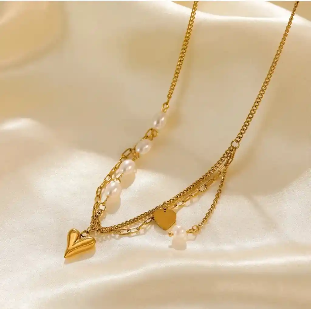 Collar doble con perlas de vidrio y dijes de corazón en acabado dorado. Diseño femenino y delicado, ideal para uso diario o para complementar looks elegantes. Ligero, cómodo y fácil de combinar.