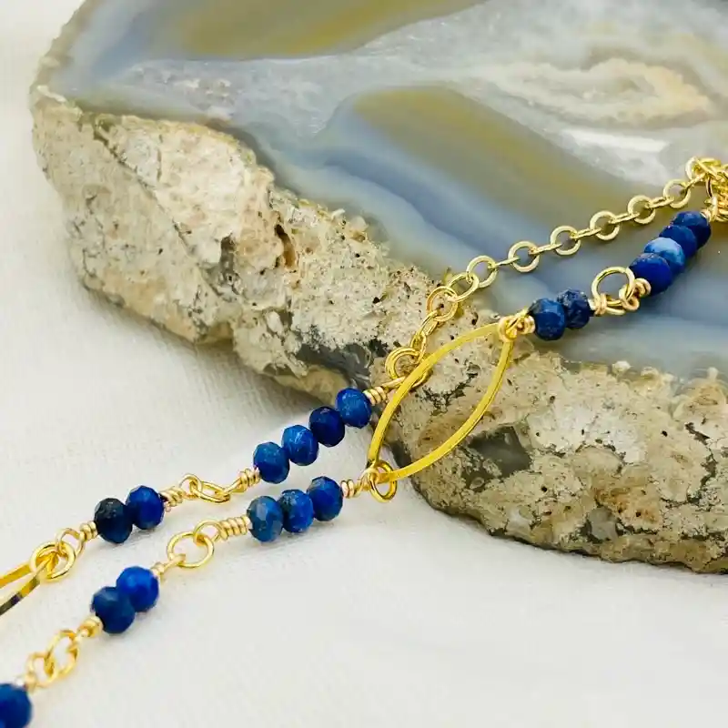 Collar con piedras Lapislazuli naturales, con ojitos y cadena dorados. Largo total del collar: 44cm. Material: bronce con baño de oro de 18k. Se entrega empacado para regalo. Recomendaciones de cuidado: Mantén tus joyas separadas unas de otras para evitar que se enreden y se rayen. Evita el uso de forma de directa de químicos como perfumes, cremas y productos de limpieza. Guarda tus accesorios limpios en un lugar seco y lejos del sol y la humedad.