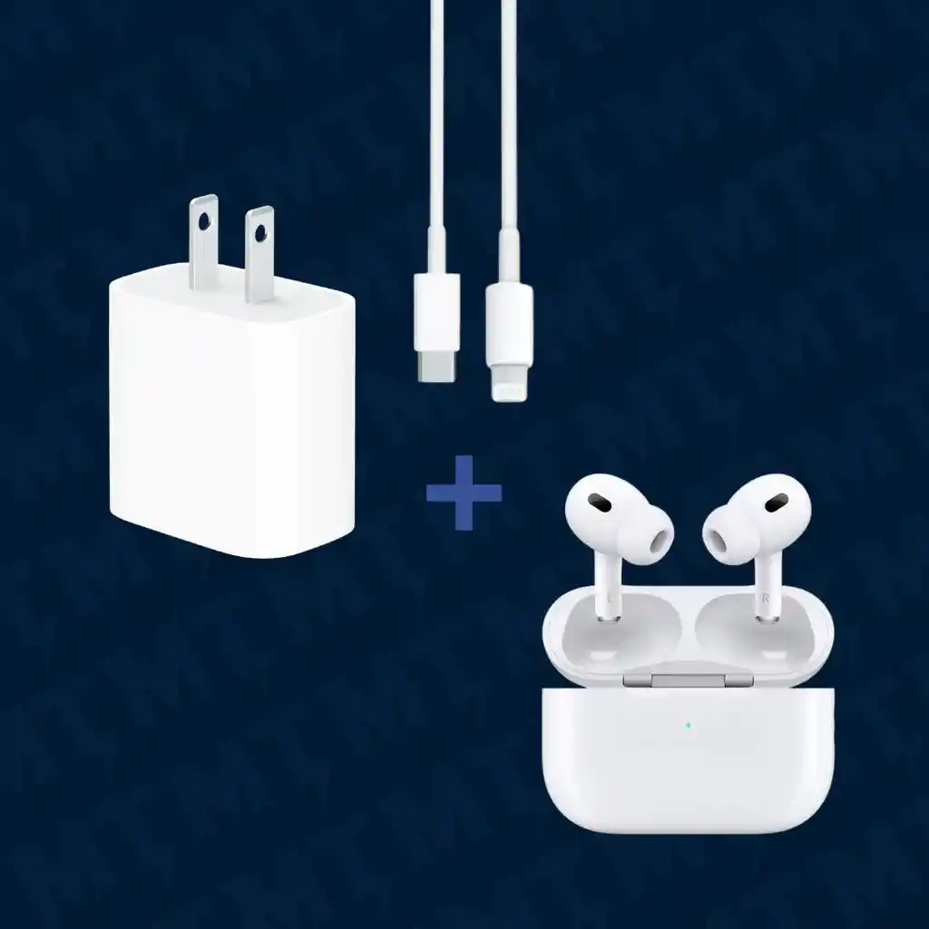 Todo lo que necesitas para tu iPhone en un solo combo. Cargador de 25W para una carga rápida y eficiente, junto a AirPods Pro 2 que ofrecen sonido envolvente y comodidad para el uso diario. Ideal para trabajo, estudio y entretenimiento. Incluye: -Cargador 25W (Calidad Estándar). -AirPods Pro 2 (Calidad Certificada).