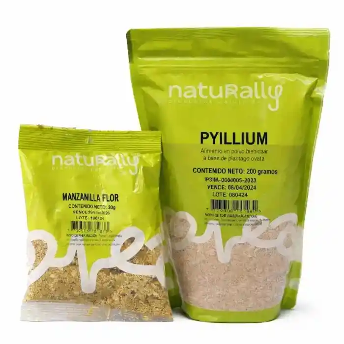 Mejora tu bienestar digestivo con este completo combo natural Naturally, diseñado para apoyar el equilibrio intestinal, la digestión y el confort estomacal de forma suave y natural. Incluye dos productos reconocidos en fitoterapia y nutrición natural que trabajan en conjunto: manzanilla para calmar y psyllium para regular. Este combo es ideal para personas que buscan apoyar su digestión, reducir la sensación de pesadez y mantener un tránsito intestinal saludable como parte de un estilo de vida equilibrado. ¿Qué incluye el combo? 1. Manzanilla Flor Naturally 30 g Flores secas de Matricaria chamomilla, tradicionalmente utilizadas en infusiones digestivas y relajantes. Principales beneficios: • Favorece la digestión después de las comidas. • Ayuda a aliviar molestias estomacales leves. • Contribuye a reducir cólicos intestinales. • Apoya la relajación y el descanso natural. • Posee propiedades calmantes y antiinflamatorias naturales. Características: • Presentación: Bolsa de 30 g • 100% flor de manzanilla seca • Libre de aditivos y conservantes Modo de preparación: Añadir 1 cucharada en 1 litro de agua recién hervida, reposar 10 minutos y colar. Consumir 1 taza, 2 o 3 veces al día. 2. Psyllium Naturally 200 g – Fibra Natural Fibra soluble de origen vegetal derivada de Plantago ovata, ideal para apoyar el tránsito intestinal. Principales beneficios: • Favorece el tránsito intestinal regular. • Contribuye al bienestar digestivo. • Apoya el control de colesterol y glucosa como parte de una dieta equilibrada. • Genera sensación de saciedad, útil en planes de control de peso. Características: • Presentación: Bolsa de 200 g • Fibra soluble de origen vegetal • Producto natural Modo de uso: Disolver de 3 a 6 g en 250 ml de agua y consumir inmediatamente. Tomar 2 a 3 veces al día, preferiblemente antes de las comidas. Beneficios del combo: • Apoyo integral al sistema digestivo • Combinación de efecto calmante y regulador intestinal • Ideal para personas con digestión lenta o irregular • Productos naturales, de origen vegetal • Fácil de incorporar a la rutina diaria Producto natural. No sustituye una alimentación equilibrada ni tratamiento médico. Registros de Invima: •Manzanilla Flor: Invima NSA-0008613-2020 •Psyllium: PSA-0004005-2023