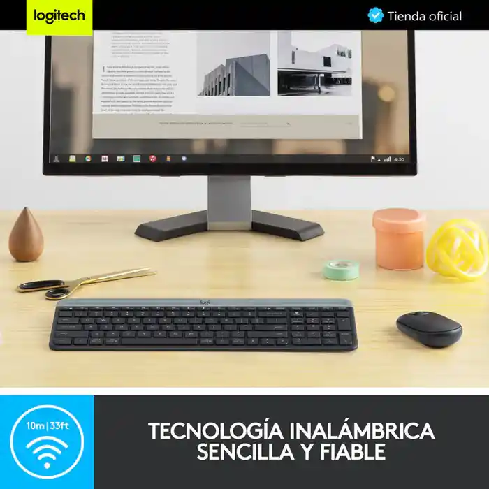 El Logitech MK470 Slim Combo es la combinación perfecta de teclado y mouse inalámbricos compactos con diseño estilizado y elegante, pensado para quienes buscan productividad en un espacio moderno y despejado. Acompañado de la alfombrilla Studio Series, tendrás un entorno de trabajo más cómodo, fluido y organizado. Combo Logitech MK470 Diseño minimalista y delgado: teclado de perfil bajo con acabado moderno. Teclado compacto con teclado numérico y 12 teclas de acceso rápido para funciones esenciales. Escritura cómoda y fluida con mecanismo de tijera de bajo perfil, similar a la experiencia de un portátil. Mouse ambidiestro compacto: diseño redondeado, suave y portátil. Trabajo silencioso: teclas y mouse hasta un 90% más silenciosos. Conexión inalámbrica fiable de 2,4 GHz con un alcance de hasta 10 m mediante nano receptor USB Plug & Play. Autonomía prolongada: hasta 36 meses de duración de baterías en el teclado y 18 meses en el mouse. Ahorro de energía automático: modo suspensión en ambos dispositivos cuando no están en uso.