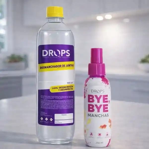 LIMPIA JUNTAS Detergente especializado para el lavado, blanqueo y desinfección de superficies en cerámica, granito, azulejo, baldosa, baldosín. El producto no incluye atomizador. Precauciones: Mantener fuera del alcance de los niños. No usar en cerámicas de colores oscuros. No usar en Marmol. Si el piso es de porcelanato debe diluirse en agua y probar poco a poco ya que existen muchos tipos de porcelanato. No mezclar con otros productos ya que puede generar fuerte reacción química. Usar guantes obligatoriamente. Evitar el contacto con los ojos y piel. Si llegase a ocurrir el contacto con los ojos o la piel, enjuague con abundante agua, si la irritación persiste consulte de inmediato con su médico. En caso de ingerir accidentalmente beba agua y busque atención médica de inmediato, en caso de intoxicación lleve al médico esta etiqueta. No inhale el producto. No reutilice este envase. Modo de Uso y dónde usarlo Puede aplicarse directamente o diluir una parte de Drops Limpia juntas por cada 4 partes de agua. Aplicar sobre la superficie y dejar actuar de 1 a 3 minutos. Estregar y enjuagar. Se puede usar en cerámica, granito, azulejo, baldosa, baldosín y porcelanato. BYE BYE MANCHAS BYE, BYE MANCHAS es seguro y parece mágico Nuestra fórmula está diseñada para eliminar las manchas de ropa, baberos, alfombras, tapicería de automóviles, muebles, toallas, manteles, etc. Precauciones: Mantener fuera del alcance de los niños y mascotas. En caso de contacto con los ojos: enjuague cuidadosamente con agua durante varios minutos. Si la irritación ocular persiste, busque atención médica. En caso de ingestión: Consulte a un médico de inmediato. SÓLO PARA USO EXTERNO. Eficacia en Diversos Tipos de Manchas: La fórmula de BYE, BYE MANCHAS es efectiva en una amplia gama de manchas, incluyendo vino, frutos rojos, tomate, jugo de remolacha, carbón, té, jugo de uva, sangre, pasto, salsas, lápiz labial y pestañina. Esto demuestra su capacidad para tratar eficazmente manchas comunes y difíciles. Modo de Uso 1. Prepara: Limpia los restos de la sustancia causante de la mancha. Tips: Para un mejor resultado, en manchas ya secas, humedezca la zona. 2. Aplica: Aplica BYE BYE Manchas en el lugar afectado (frote si es necesario) Tips: Para telas delicadas, humedezca una toalla de papel y distribuya la cantidad necesaria. 3. Enjuaga: Elimina todos los residuos para que no quede ningún rastro. Lave o limpie como de costumbre la prenda. Tips: Si la mancha no desaparece, repita el proceso. 4. Disfruta: Deja de pensar en los incidentes con manchas y disfruta de tus momentos de felicidad. Tips: Siempre lleva tú BYE BYE Manchas contigo.