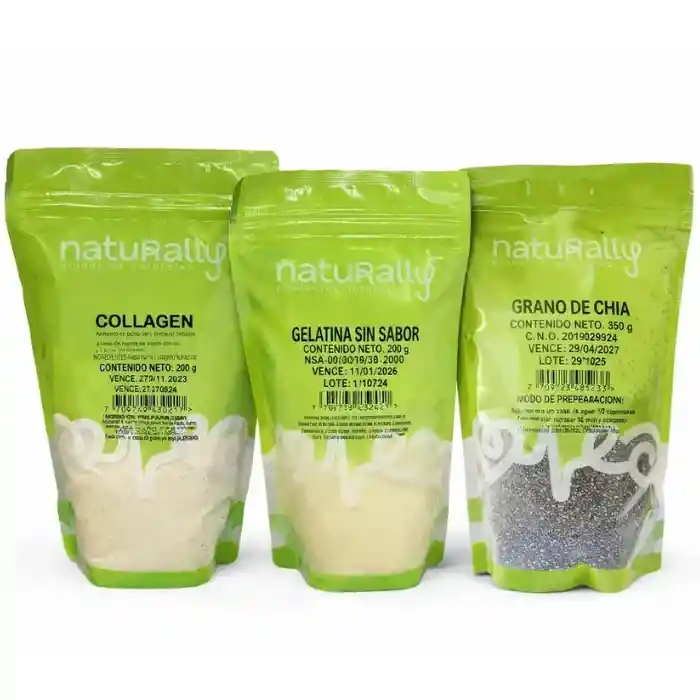 El Combo Naturally Bienestar Integral reúne tres superalimentos esenciales que actúan de forma complementaria para apoyar la salud de la piel, las articulaciones, el sistema digestivo y la nutrición diaria. Ideal para quienes buscan resultados visibles desde el interior con productos naturales, seguros y de alta calidad. Este combo está diseñado para fortalecer tejidos, mejorar la digestión, aportar proteínas y grasas saludables, y apoyar un estilo de vida activo y equilibrado. Incluye: • Colágeno Hidrolizado Naturally 200 g: Apoya la firmeza y elasticidad de la piel, fortalece uñas y cabello, y contribuye al cuidado de huesos y articulaciones. • Gelatina Sin Sabor Naturally 200 g: Fuente natural de colágeno y proteínas que favorece la regeneración celular, la salud articular y el bienestar digestivo. • Semillas de Chía Naturally 250 g: Superalimento rico en Omega 3, fibra y antioxidantes que apoya la digestión, la saciedad y la salud cardiovascular. Beneficios del combo: • Mejora la apariencia de la piel, cabello y uñas. • Fortalece articulaciones, huesos y cartílagos. • Apoya la digestión y el tránsito intestinal. • Aporta proteínas, fibra y grasas saludables. • Ideal para hombres y mujeres que buscan bienestar integral. Modo de uso sugerido: Consumir el colágeno y la gelatina una vez al día disueltos en bebida de preferencia. Incorporar la chía en agua, jugos, batidos o alimentos según recomendación diaria. Registros Invima: • Colágeno Hidrolizado Naturally 200 g: PSA-0004005-2023 • Gelatina Sin Sabor Naturally 200 g: NSA-0009038-2020 • Semillas de Chía Naturally 250 g: C.N.O. 2019029524