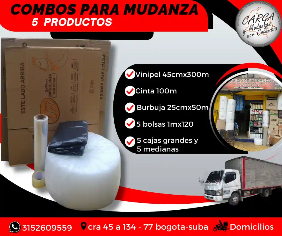 Incluye: 5 Cajas Medianas 5 Cajas Grandes 5 Bolsas Industriales 1 Rollo Pelex de 45 cm de alto x 300 mts de largo 1 Rollo de Plástico Burbuja 30 cm alto x 50 Mts de largo 1 Rollo de cinta x 100 mts Alta Calidad - Productos Garantizados. Visítanos: Cr. 45a # 134 - 77 Local Esquina Contáctanos: 315 2609 559 *ASESORIA SIN COSTO POR WHATSAAP*