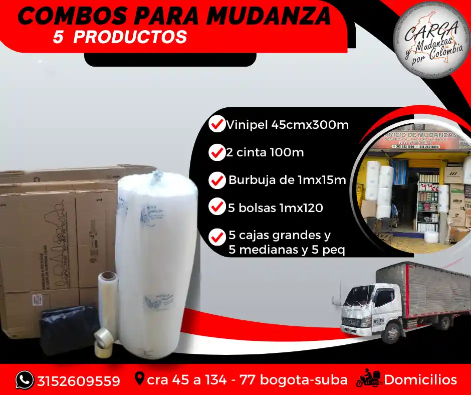 Incluye: 5 Cajas pequeñas 5 Cajas Medianas 5 Cajas Grandes 5 Bolsas Industriales 1 Rollo Pelex de 45 cm de alto x 500 mts de largo 1 Rollo de Plástico Burbuja 1mts x15 Mts de largo 2 Rollo de cinta x 100 mts Alta Calidad - Productos Garantizados. Visítanos: Cr. 45a # 134 - 77 Local Esquina Contáctanos: 315 2609 559 *ASESORIA SIN COSTO POR WHATSAAP*