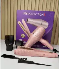 Secador de Pelo: Diseño ergonómico en color rosa con acabado de diamante texturizado. Plancha Alisadora: Plancha de pelo con placas de cerámica (o similar) en el mismo diseño rosa texturizado.