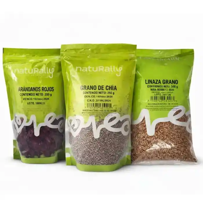 Optimiza tu alimentación diaria con el Combo de Superalimentos Naturally, una selección premium de productos naturales ricos en fibra, antioxidantes y ácidos grasos esenciales, ideales para apoyar la digestión, la salud cardiovascular y el bienestar general. Este combo incluye tres superalimentos cuidadosamente seleccionados, en presentaciones prácticas y de alta calidad, perfectos para quienes buscan una alimentación equilibrada y funcional. Incluye: * Arándanos Rojos Deshidratados Naturally – 200 g Fuente natural de antioxidantes, flavonoides y fibra. Contribuyen al cuidado del sistema urinario, la salud cardiovascular y la protección celular frente al estrés oxidativo. Ideales como snack saludable o para agregar a yogures, batidos, cereales y postres. Registro Invima: NSA-0009078-2020 * Semillas de Chía Naturally – 250 g Superalimento rico en Omega 3, fibra, proteínas y minerales esenciales. Apoya la digestión, el control del apetito y la salud del corazón. Versátil y fácil de incorporar en bebidas, yogures, ensaladas y preparaciones saludables. Registro Invima: C.N.O. 2019029524 * Linaza en Grano Naturally – 500 g Fuente vegetal de fibra soluble e insoluble, Omega 3 y Omega 9. Favorece el tránsito intestinal, ayuda a regular el colesterol y contribuye al bienestar digestivo. Ideal para infusiones, batidos y alimentos funcionales. Registro Invima: NSA-0008613-2020 Beneficios del combo: * Aporte completo de fibra dietética natural * Rico en antioxidantes y ácidos grasos esenciales * Apoya la digestión y la salud intestinal * Contribuye al bienestar cardiovascular * Ideal para dietas saludables y planes de nutrición balanceada * Productos naturales, sin conservantes ni colorantes artificiales •Modo de uso general: Consumir de forma individual o combinada según preferencia: en batidos, jugos, yogures, ensaladas, cereales o como infusión. Uso diario recomendado dentro de una alimentación equilibrada