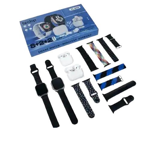 Combo tecnológico que incluye dos pares de audífonos tipo AirPods y dos relojes inteligentes, ideal para compartir, regalar o uso familiar. Una opción práctica que reúne conectividad y funciones básicas en un solo paquete.