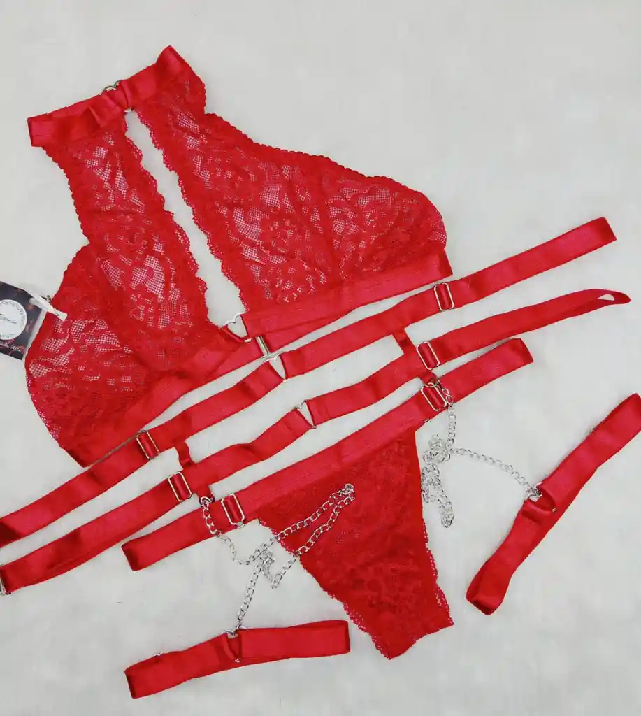 CONJUNTO DE LENCERIA, EN ENCAJE ROJO, DE 3 PIEZAS (BRA, PANTY, Y LIGUERO) TALLA UNICA AJUSTABLE