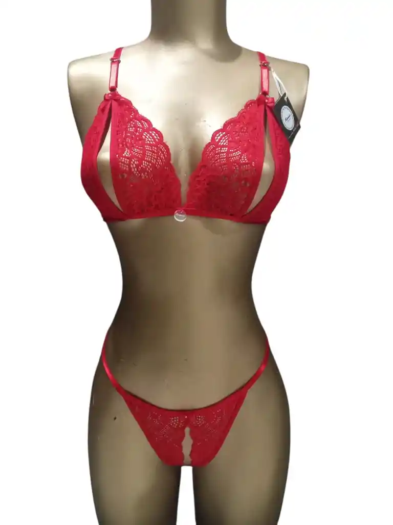 CONJ. EROTICO FABRICADO EN ENCAJE ROJO DE 2 PIEZAS ( PANTY Y BRA) CON ABERTURAS, TALLA UNICA AJUSTABLE