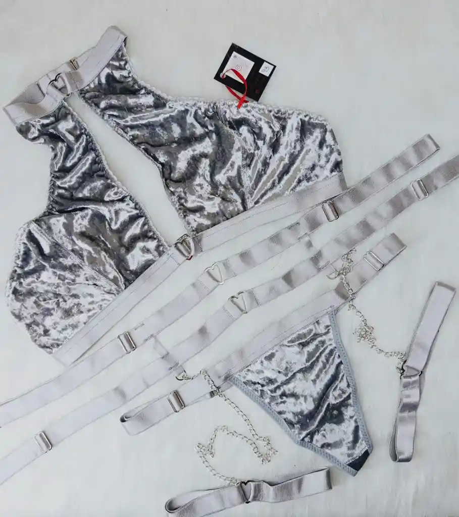 CONJUTO DE LENCERIAA EN TERCIOPELO PLATEADO, DE TRES PIEZAS ( BRA, PANTY Y LIGUERO) TALLA UNICA AJUSTABLE