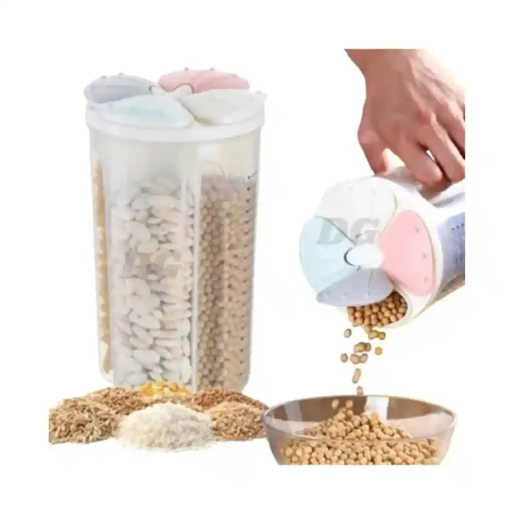 Contenedor Dispensador de cereales, recipiente hermético de almacenamiento de alimentos sin BPA, dispensador de cereales de plástico grande para cocina con tapas y compartimentos para granos, azúcar, harina, arroz, frutos secos, aperitivos (2.5 L) Hecho de plástico EPP de alta calidad, probado para ser duradero y duradero. Los recipientes transparentes hacen que sea fácil saber cuál es el contenido sin la necesidad de etiquetas y marcadores. Diseño de división: este dispensador de cereales tiene compartimentos extraíbles que funcionan como separadores para clasificación de alimentos, multiusos y práctico. El tablero de partición interior se puede quitar. Las gradaciones de medición precisas en el cuerpo hacen que la medición y la porción sea fácil. Estos recipientes de almacenamiento de alimentos con 4 tapas son completamente herméticos, a prueba de fugas y derrames. Las tapas de bloqueo también pueden resistir las manchas, asegurando que no entre aire o agua en el recipiente, lo que puede mantener la comida fresca durante mucho tiempo. Capacidad suficiente para contenedores de almacenamiento de alimentos con tapas. Adecuado para almacenar cereales, arroz, frijoles, azúcar, aperitivos, harina, nueces, granos, café, té, cheerios, frutas secas, condimento de cocina, pasta e incluso comida para mascotas Ahorro de espacio: estos duraderos soportes para cereales han sido especialmente diseñados para minimizar el espacio y caben fácilmente en tu refrigerador, congelador o armarios, lo que te permite organizar la cocina y liberar espacio en el armario de la despensa. Apto para refrigerador/microondas con las tapas abiertas. Material: Plastico de Grado Aimenticio Capacidad: 2.5 L Cantidad de Divisiones: 4 Tamaño: 25 x 14 cm Peso: 80 g