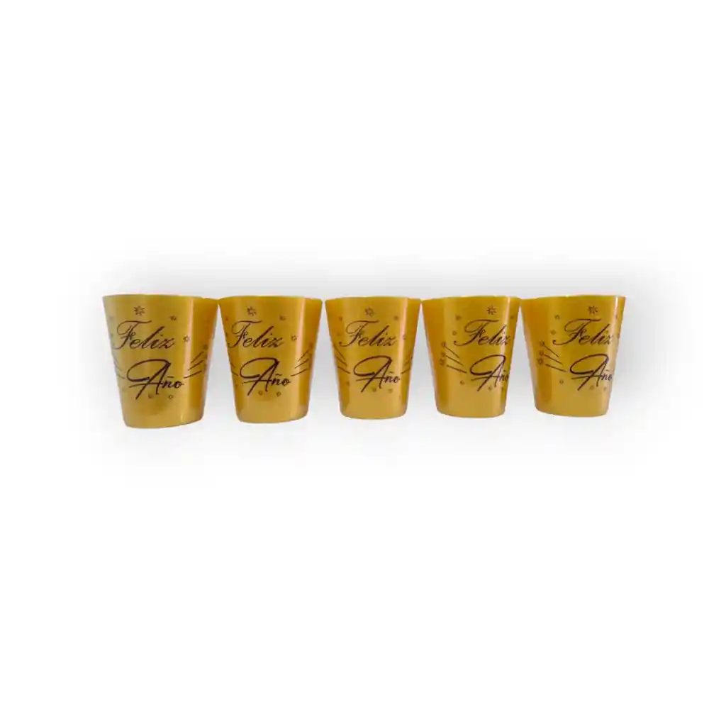 copas de plastico color dorado con estampado de feliz año aproximadamente 2 onzas si deseas alo mas indicanos y con usto te colaboramos