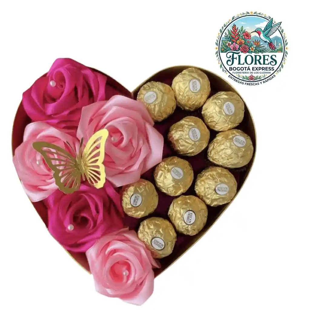 Encantador arreglo en forma de corazón elaborado con delicadas rosas artificiales en tonos rosados y fucsia, acompañado de irresistibles chocolates Ferrero. Su diseño combina ternura y elegancia, resaltado con un detalle de mariposa que aporta un toque romántico y sofisticado. Al ser flores artificiales, este regalo perdura en el tiempo como símbolo de amor eterno, ideal para sorprender con dulzura en cualquier ocasión especial.