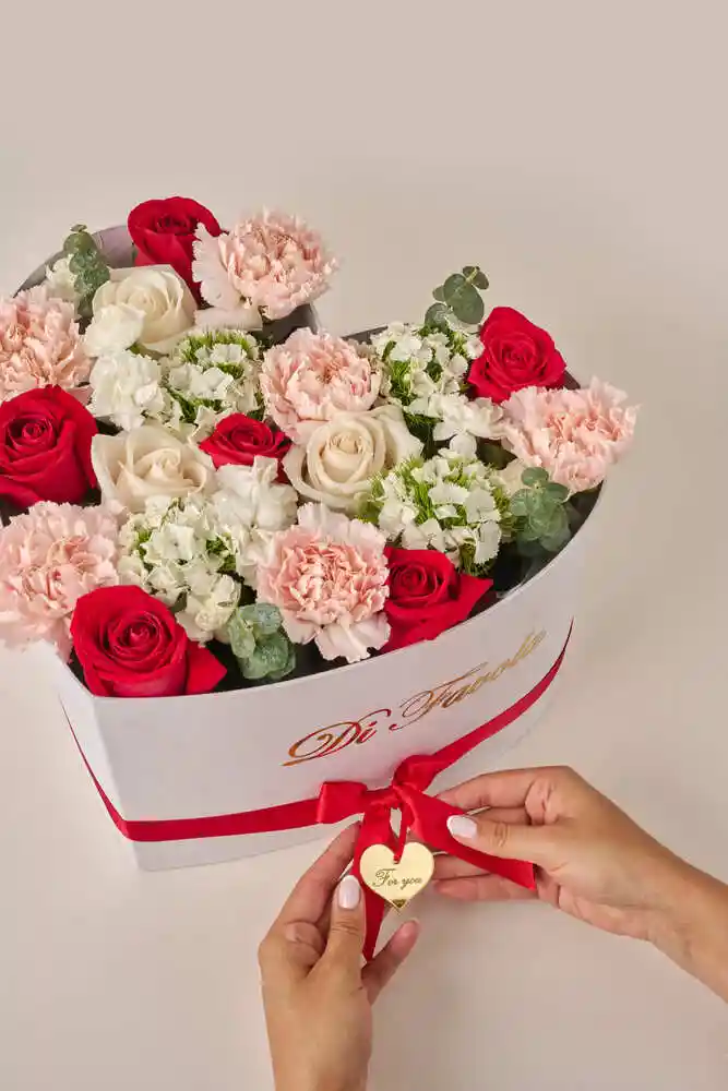 Un corazón de flores mixtas combina texturas y colores en un diseño orgánico que simboliza unión, amistad y sentimientos que trascienden. Un detalle romántico y sofisticado para expresar lo que las palabras no alcanzan en este Amor & Amistad.