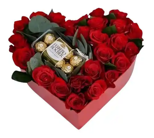 Arreglo en forma de corazón con rosas rojas frescas y chocolates premium, diseñado con estilo sofisticado y detalles que enamoran a primera vista. Algunas flores pueden variar sutilmente según la temporada, manteniendo siempre la frescura, el diseño y el valor del arreglo. Incluye tarjeta personalizada sin costo para acompañar tu mensaje especial.