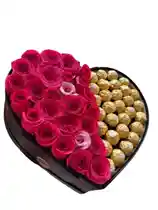 Caja grande de corazón con 30 rosas fucsias y 28 chocolates Nota: La flor puede ser sustituida dependiendo la disponibilidad de color y del producto “Mensaje Personalizado” máximo de 30 caracteres (Dejar el mensaje en el chat, los comentarios no se previsualizan para la tienda por lo que si se dejan allí no podrá ser incluido).