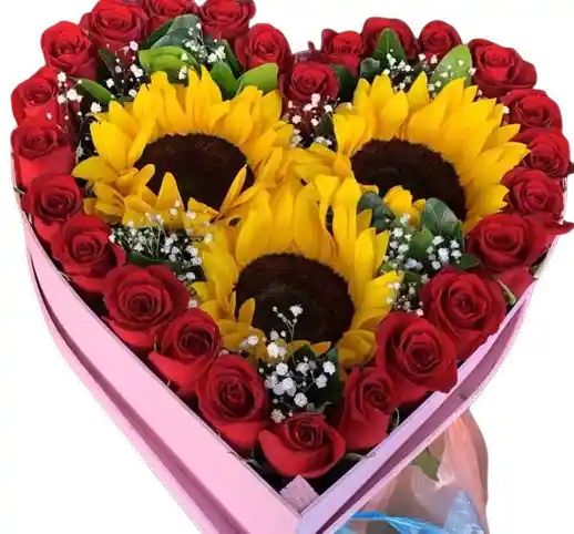 Arreglo en forma de corazón con girasoles y rosas rojas frescas, diseñado con flores de alta calidad y un estilo vibrante que combina amor y energía. Algunas flores pueden variar sutilmente según la temporada, manteniendo siempre la frescura, el diseño y el valor del arreglo. Incluye tarjeta personalizada sin costo para acompañar tu mensaje especial.