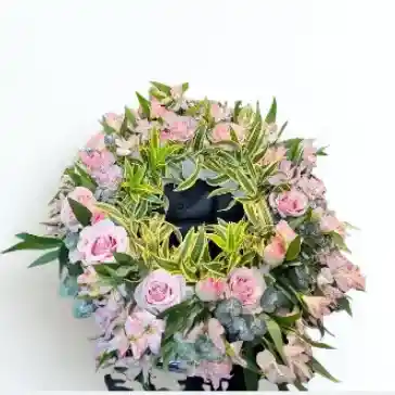 HERMOSA CORONA FUNEBRE COMPUESTA POR 30 ROSAS ROSADAS, 3 PAQUETES DE ASTROMELIA BLANCA Y ROSADA, CON FOLLAJE DE CANTO DEL INDIO