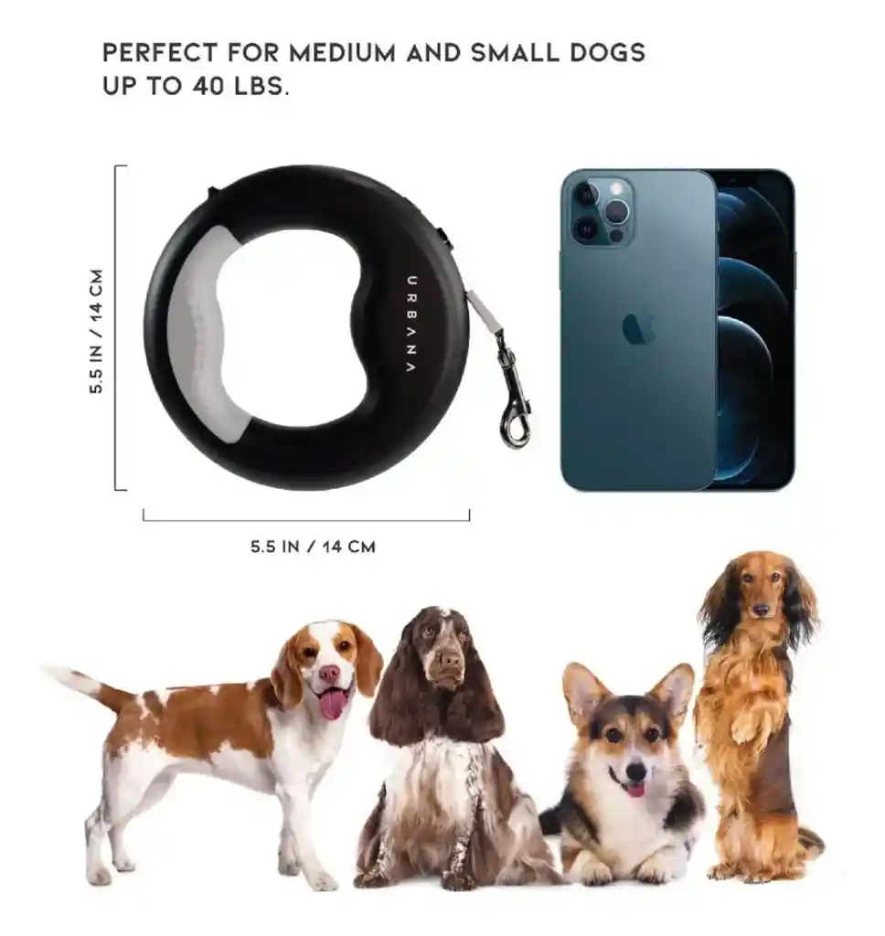 Correa retráctil: correa de paseo para mascotas de 3 metros para perros pequeños y medianos de hasta 44 libras de 360°, material ABS resistente a los impactos, resorte helicoidal interno de acero inoxidable para una retracción constante durante varios años. Fácil de operar: Freno y bloqueo con una sola mano, lo que permite que la correa del perro se ajuste a una longitud cómoda con facilidad, pasear a tu perro libremente en áreas abiertas con una sola mano, garantiza que tengas un control completo sobre la seguridad de tu perro. Correa para perro con linterna: luz LED de alta concentración, con un alcance de 3.5 Metros, te da la máxima visibilidad y seguridad mientras caminas por la noche. con puerto de carga USB, recargable. Mango ergonómico antideslizante de goma TPE suave en forma de arco para ayudarte a mantener cómodamente un fuerte agarre en perros que tiran y corren, además, puedes ponerlo en tu muñeca para liberar tus manos. Especificaciones: Material: nailon, ABS. Tamaño: 14 cm x 14 cm/5,51 pulgadas x 5,51 pulgadas, Longitud de la correa: 3 m Peso: 220g Peso Maximo Soportado: 44 Lbs El paquete incluye: 1* Correa de perro retráctil con luz LED 1* Cable de Carga USB-C