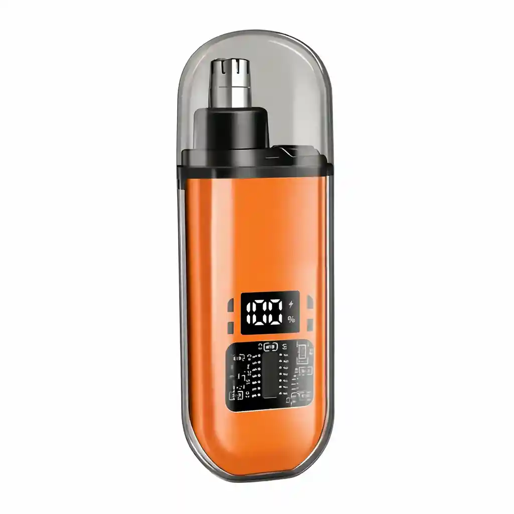 Moderna y bella cortadora de vellos de la nariz. Potente, efectiva. No hala los pelos. Batería con mucha duración y hermoso diseño naranja. Carga USB. Incluye cables.