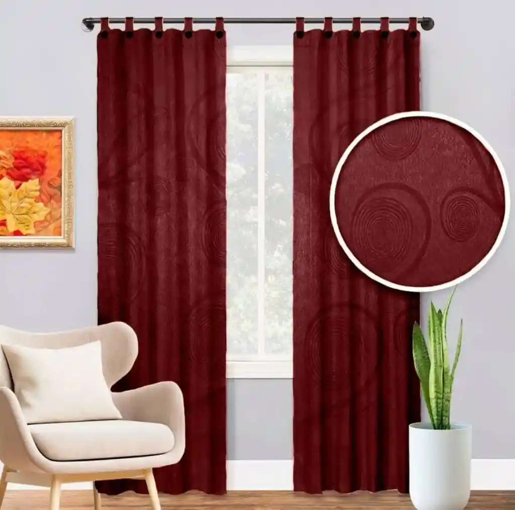 Cortina Jacquard vinotinto para ventana de sala o habitación (El diseño en el patrón de la tela depende de la disponibilidad) Medidas: 140 cm de ancho x 200 cm de largo por paño, medida total: 280 cm de ancho x 200 cm de largo. - Este tipo de cortina viene con tela en relieves variado de diseños o flores, no liso unicolor Beneficios: Elegancia y estilo. Material duradero. Cobertura completa. Producto Colombiano. Características: Material: Jacquard. Contiene: 2 piezas y 2 tiras para amarre.