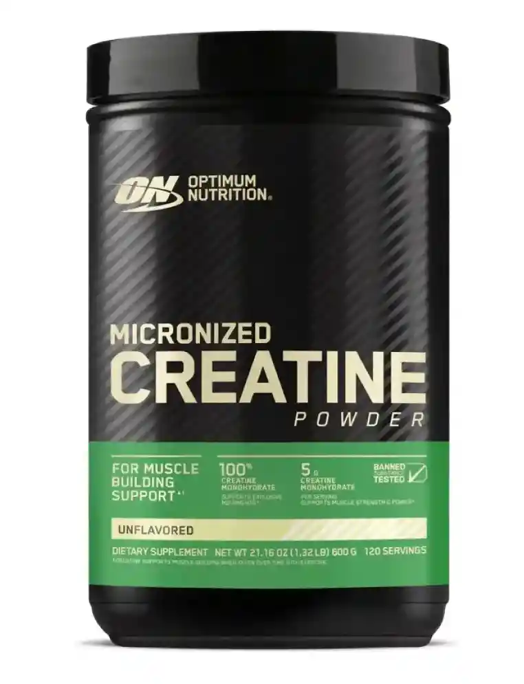 Optimum Nutrition. Creatina en polvo micronizada 1,32 Libras (600 gramos). Sin sabor. 120 porciones. ----------IMPORTANTE---------- Creatina Optimun Nutrition 100% original importada de USA, la creatina puede llegar en tapa blanca o tapa negra, teniendo en cuenta que la última presentación del tarro llega con tapa blanca y sello de seguridad blanco. Apoya la construcción muscular, recuperación, rendimiento, fuerza y potencia cuando se utiliza diariamente, con el tiempo y combinado con ejercicio. 0.18 oz de 100% pura creatina monohidrato - uno de los ingredientes de suplemento más estudiados. Información de seguridad: Este producto está etiquetado según los estándares de los Estados Unidos y puede diferir de productos similares vendidos en otros lugares en sus ingredientes, etiquetado y advertencias de alérgenos. Ingredientes: Monohidrato de Creatina. Instrucciones: Agregue 1 cucharadita redondeada de polvo de creatina micronizada a un vaso lleno con 8-12 oz de agua fría o jugo de frutas. Luego mézclalo con una cuchara. CONSEJO: Batidos de proteínas, sustitutos de comidas y para ganar peso con una cucharadita redondeada de polvo de creatina micronizada. USO SUGERIDO: CARGA DE CREATINA: Tome 1 cucharadita redondeada de polvo de creatina micronizada con las comidas de la mañana, la tarde y la noche y 1 cucharadita redondeada adicional antes de acostarse durante 4-5 días para ayudar a saturar sus músculos. Las declaraciones relacionadas con suplementos dietéticos no han sido evaluadas por la FDA y no pretenden diagnosticar, tratar, curar o prevenir ninguna enfermedad o condición de salud.