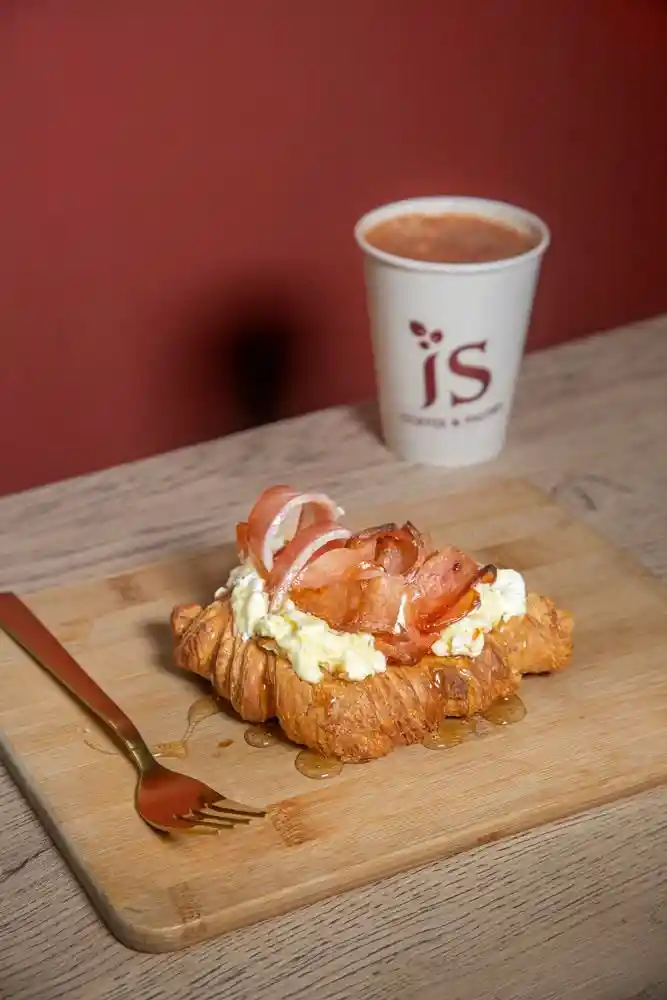 Croissant cubierto con queso crema y tocineta, finalizado con miel. Una opción completa y equilibrada.