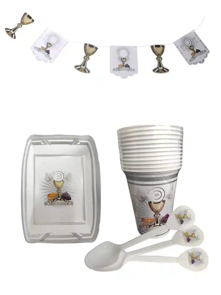 Cubiertos para mi primera comunion 12 vasos 12 platos con forma rectangular 12 cucharas 1 guirnalda de mi primera comunion si deseas algo adicional indicanos y con gusto te colaboramos
