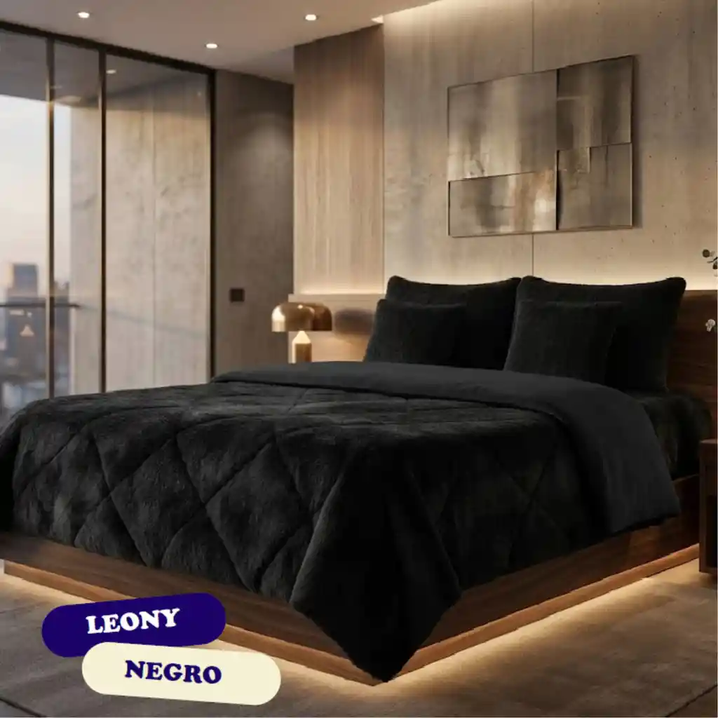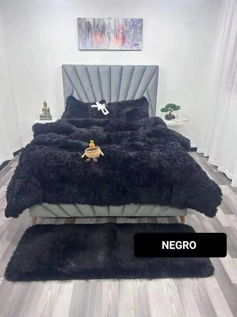 Cubrelecho Doble Peludo Negro 5 Piezas, doble faz con piel de ángel. Medidas: Para cama doble 140 x 190 cm Plumón: 220x240 cm Dos fundas: 50x70 cm Dos cojines con relleno siliconado: 35x35 cm Cubrelecho de alta calidad, tela en terciopelo peluche por uno de sus lados y el otro piel de ángel. Relleno de fibra siliconada. Costura especial que asegura el relleno a largo plazo. Hecho en Colombia. Cubrelecho, Cubrecama, Edredon, Plumon