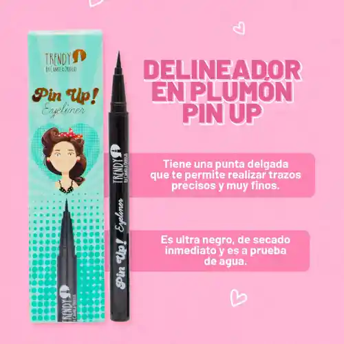 DELINEADOR en Plumón Pin Up Trendy: Este producto es popular por su punta delgada y flexible de alta precisión que permite trazos finos y definidos, esenciales para un delineado "cat eye" estilo pin up. Cuenta con una fórmula ultra negra, de secado rápido y a prueba de agua, lo que asegura un acabado duradero y sin manchas. Características Principales: -Color: Negro intenso para un look impactante. -Duración: Fórmulas de larga duración, algunas de hasta 16 o 24 horas. -Resistencia: A prueba de agua y/o resistentes a manchas. -Aplicación: Puntas de alta precisión (plumón o pincel) que permiten un trazo fácil y controlado, ideal para el icónico flick (rabillo) del delineado pin up. -Secado: Secado inmediato para evitar transferencias en el párpado. -Estos productos son adecuados para quienes buscan lograr el clásico estilo pin up, conocido por el delineado alado y definido.