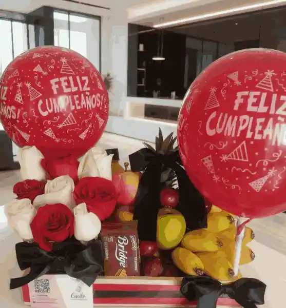 Contenido: 1 Galleta de Chocolate 1 Cubo De rosas Rojas y Blancas 1 Piña Entera 1 ramo de banano Bocadillo 3 Manzanas 1 Jugo Natural 1 Bandeja de Ciruelas 1 Tarjeta Personalizada 1 Decoración Personalizada