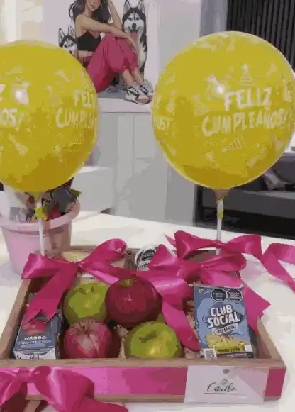 Contenido. 1 Sándwich de Jamón queso y Vegetales 1 Jugo Natural 1 Yogurt 1 Maní 2 Manzanas 2 Galletas 1 Muffins o Postre 1 Porción de Fruta 1 Decoración Personalizada 1 Tarjeta Personalizada