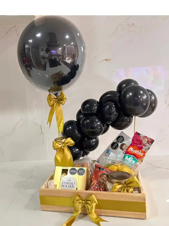📝 Descripción: Sorprende con un desayuno exclusivo de estilo elegante y moderno 🖤✨ Hermosa presentación en tonos negro y dorado, decorado con moños en cinta dorada y globo burbuja personalizado con el mensaje que desees 💌 Incluye: 🥪 Sándwich fresco en pan tipo brioche con jamón de pavo y queso mozzarella 🍊 Jugo natural de naranja 🍓 Bowl de frutas seleccionadas 🍫 Chocolates Ferrero Rocher 🥜 Maní 🍪 Galletas Chokis 🍬 Frasco de vidrio con masmelos ✨ Diseño sofisticado y presentación premium 🎁 Listo para regalar 🚚 Perfecto para sorprender a domicilio 💌 Ideal para cumpleaños, aniversarios o sorprender con un detalle elegante y diferente