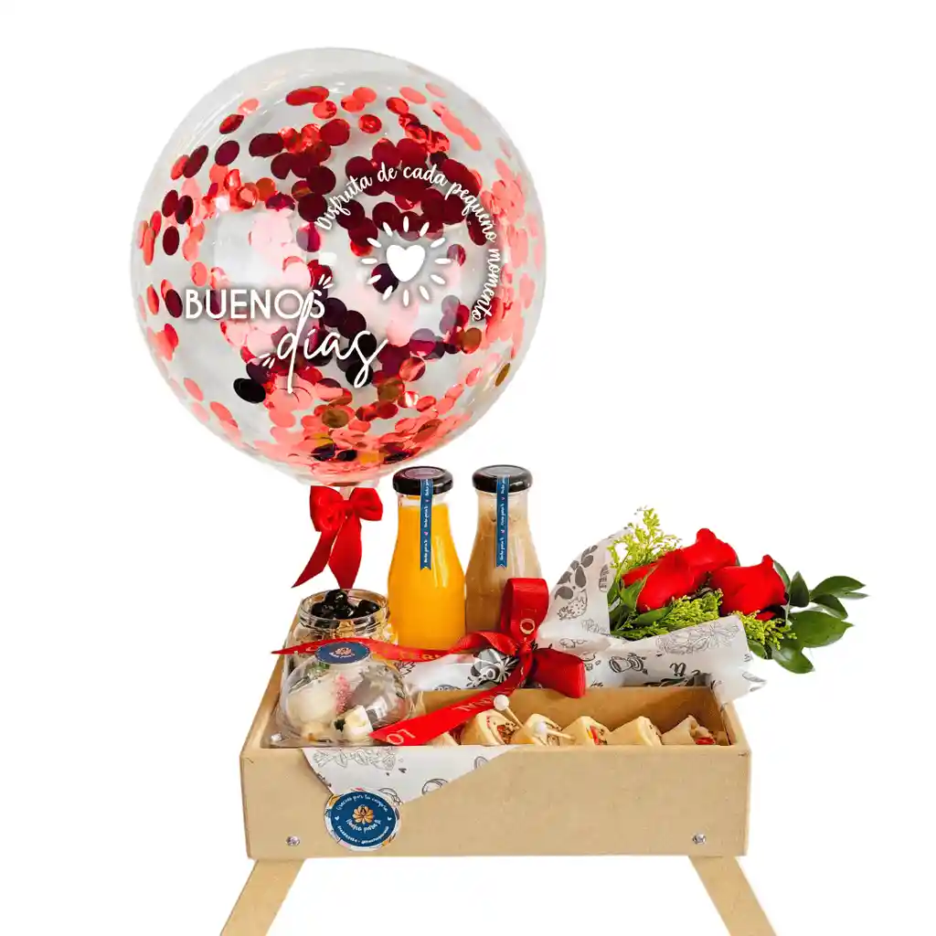 Desayuno Admirador Una propuesta elegante y romántica para sorprender en cualquier ocasión 🌹. Incluye jugo de naranja 250 ml, bebida achocolatada, wraps de jamón, queso, lechuga y queso crema, fresas cubiertas con chocolate, parfait con yogur griego, frutos secos, fruta fresca, dulce de frutos rojos y semillas, bouquet de rosas, base en madera y globo burbuja. Si nos envías tu mensaje, te obsequiamos la tarjeta personalizada para expresar tus sentimientos de manera única ✨. REF: T02