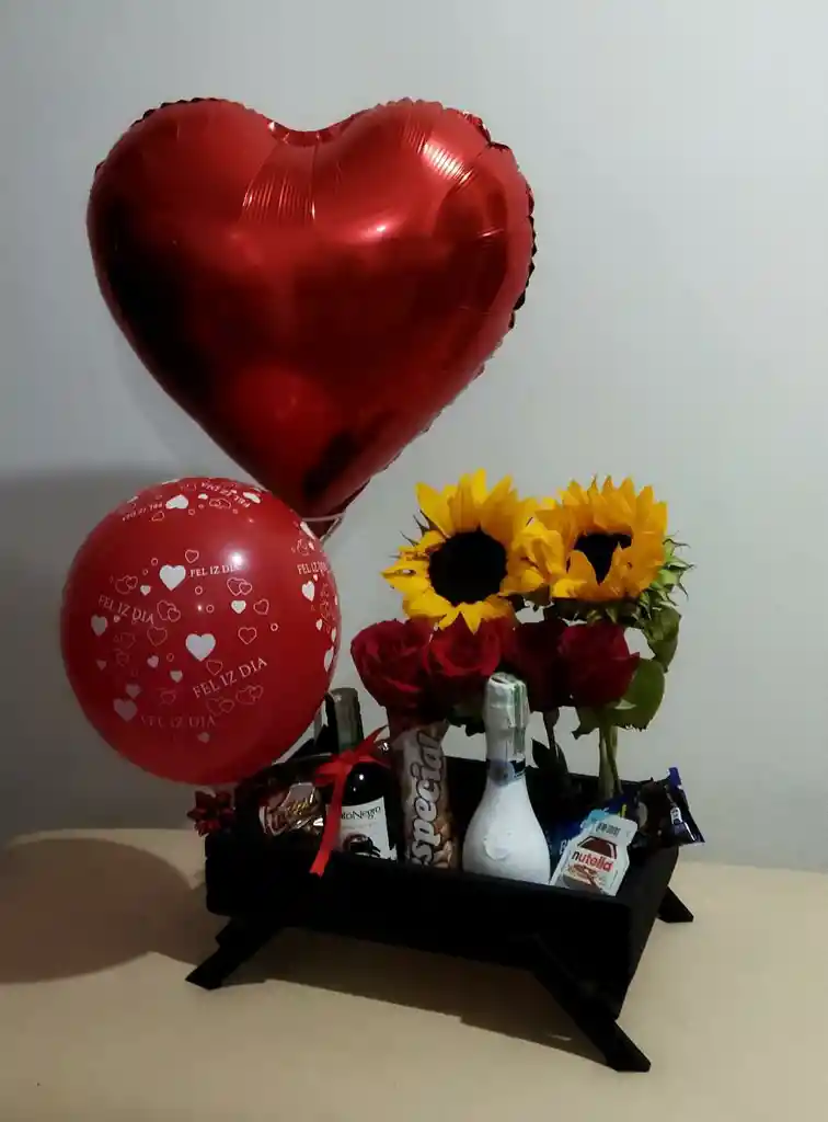 Sorprende con este hermoso detalle que contiene: 2 girasoles 4 rosas Nutela o nucita pequeña Champaña Jp Chanel de 200 ml o en lata x 250 ml Mini Vino de 187 Ml Maní Galletas Piazza Chocolatina Globo Metalizado según la ocasión Bombas Decorativa Frase personalizada (Por favor escribir al WhatsApp 3144524281 la frase personalizada)