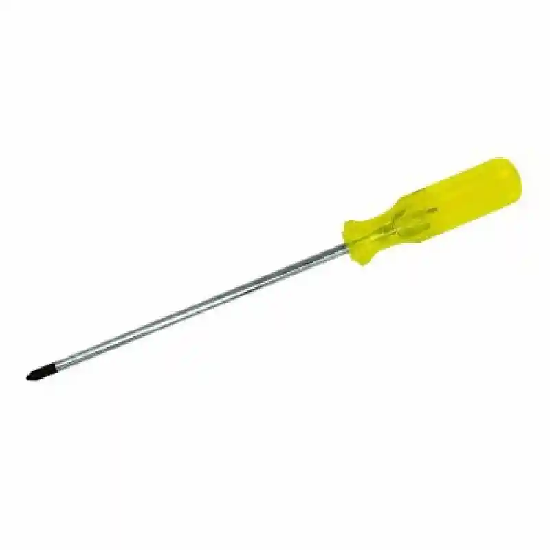 Descripción: Herramienta manual diseñada para apretar o aflojar tornillos de cabeza en cruz (Phillips). Cuenta con un mango plástico amarillo ergonómico que proporciona un agarre cómodo y seguro, y una varilla metálica resistente con punta en forma de cruz, ideal para trabajos de ensamblaje, electricidad y reparaciones generales en el hogar o taller.