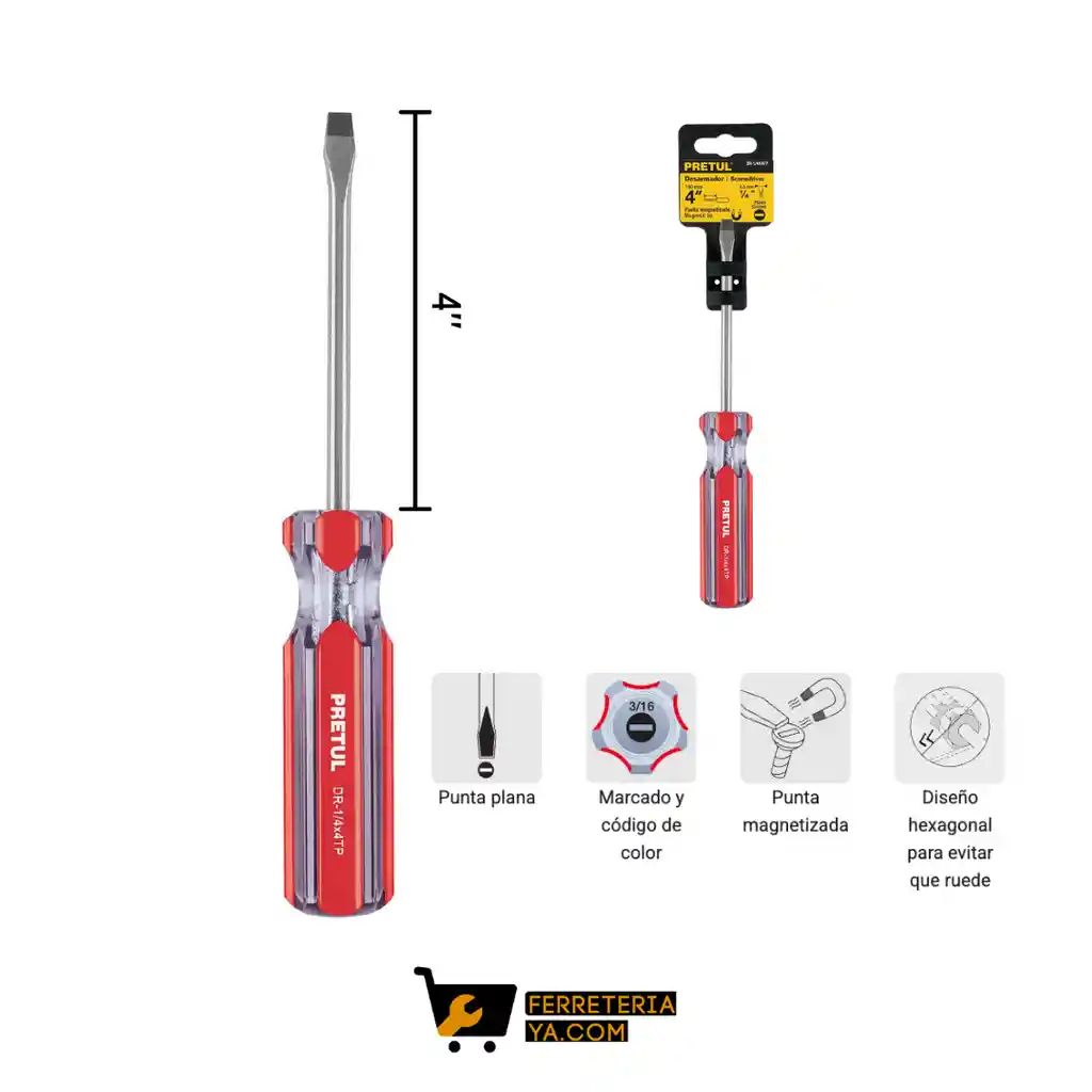 Destornillador Con Mango Plástico Desarmador plano 1/4 x 4" mango de PVC, Pretul Barra de acero al carbono Mango de PVC Marcado y código de color para fácil identificación de medida y punta