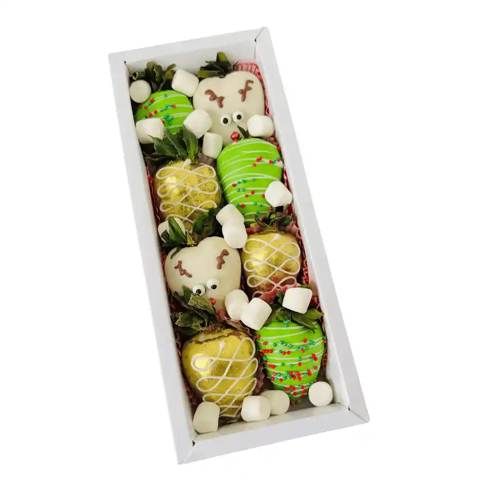 Nuestras “Fresas por 8 Navideñas” son un detalle perfecto para sorprender con un regalo dulce, fresco y festivo; incluye ocho fresas cubiertas con chocolate en diseños navideños 🍓🍫, una caja con tapa en acetato que realza la presentación, mini masmelos suaves y un empaque ideal para compartir en familia, enviar a alguien especial o regalar en celebraciones corporativas. Es una opción deliciosa, práctica y muy buscada en temporada. Te podemos obsequiar una tarjeta si nos envías el mensaje para que acompañes tu detalle.