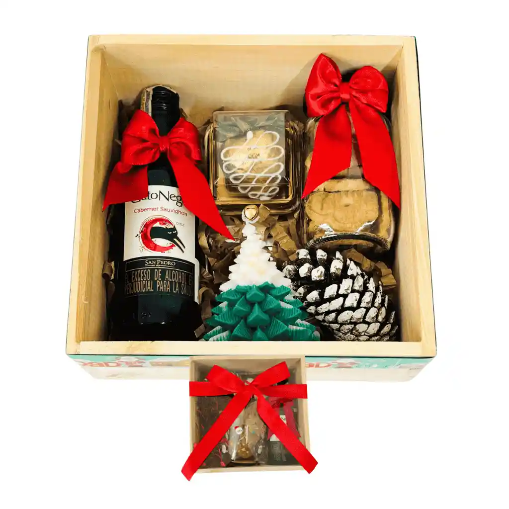 “Alegría Pura” es un detalle navideño premium diseñado para sorprender con un regalo elegante y lleno de encanto; incluye una botella de vino de 185 ml 🍷, un tarro de galletas navideñas 🍪, una fresa cubierta con chocolate temática 🍓✨, una vela aromática en forma de árbol 🌲, una piña navideña decorativa y una base en madera que realza la presentación y le da un toque cálido y sofisticado. Es un detalle perfecto para clientes, colaboradores, parejas o familiares que disfrutan los regalos cuidados y festivos en esta temporada. Te podemos obsequiar una tarjeta si nos envías el mensaje para que acompañes tu detalle.