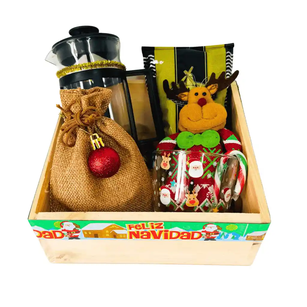“Línea Dorada” es un detalle navideño premium ideal para sorprender con un regalo elegante y lleno de encanto; incluye una prensa francesa mediana ☕, café molino de excelente aroma, una bolsita de yute con tres bolsitas surtidas que contienen galletas navideñas 🍪, masmelos y snacks, una tacita navideña 🎄, un muñequito decorativo, un bastón de dulce 🍭 y una base en madera que realza la presentación con un toque cálido y sofisticado. Es una opción perfecta para amantes del café, colaboradores, clientes o familiares que disfrutan los detalles cuidados y festivos. Te podemos obsequiar una tarjeta si nos envías el mensaje para que acompañes tu detalle.
