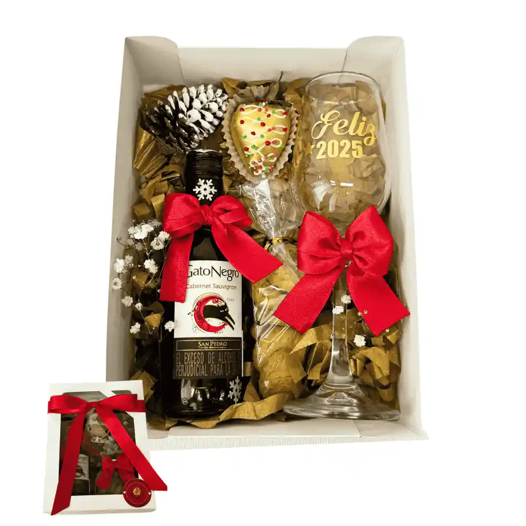 “Noche Buena” es un detalle navideño premium pensado para sorprender con elegancia y sabor; incluye una botella de vino de 185 ml 🍷, una copa 2026 brillante 🥂, una bolsita de galletas navideñas 🍪, una fresa cubierta con chocolate temática 🍓✨, una piña navideña decorativa y una caja presentada con diseño festivo que resalta cada elemento. Es un regalo perfecto para clientes, familiares, parejas o colaboradores que disfrutan los detalles cuidados y llenos de magia en esta temporada. Te podemos obsequiar una tarjeta si nos envías el mensaje para que acompañes tu detalle.