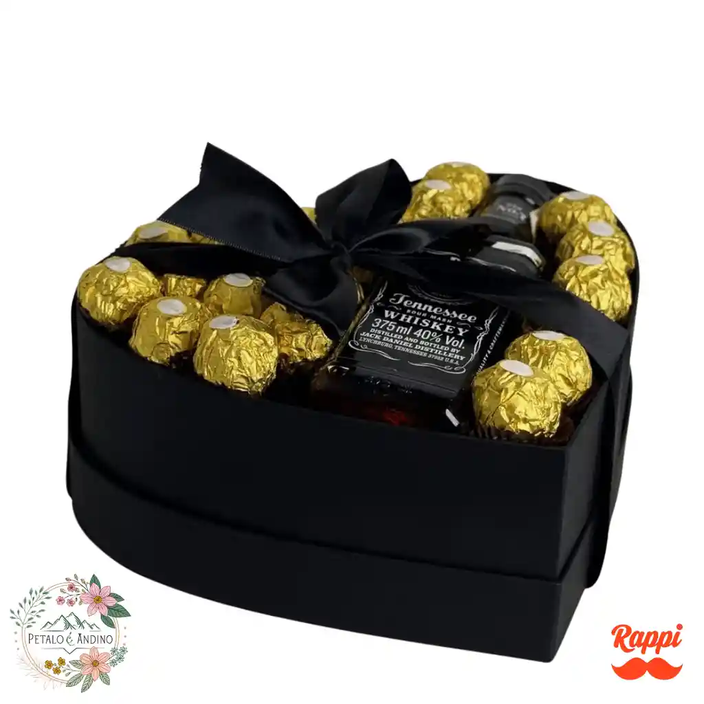 Este exclusivo detalle está diseñado para sorprender a caballeros con un estilo sofisticado y moderno. Presentado en una elegante caja en forma de corazón en color negro con lazo decorativo, es perfecto para ocasiones especiales como cumpleaños, aniversarios o celebraciones románticas. Incluye una combinación ideal de sabores intensos y dulces: Botella de whisky (presentación 750ML), ideal para disfrutar un momento especial. Chocolates tipo Ferrero, que aportan un toque dulce y premium. Caja decorativa de lujo con acabado elegante en negro. Mensaje “¡Te Amo!”, perfecto para expresar cariño de manera especial. Este detalle combina lo clásico y lo elegante, creando una experiencia sofisticada y masculina, ideal para sorprender a ese hombre especial con un regalo único, práctico y lleno de estilo.