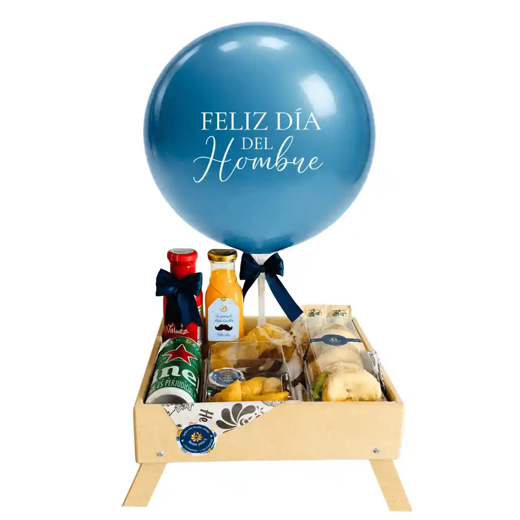 Un desayuno sorpresa perfecto para el Día del Hombre, diseñado para celebrar con sabor y detalles que marcan la diferencia 🍔🍺. Incluye jugo de naranja 250 ml, café frío Juan Valdez, un delicioso pincho de mini hamburguesas, papas chips crujientes, empanaditas, y una cerveza para brindar desde temprano. Todo viene presentado sobre una base de madera con cubiertos ecológicos y salsas, acompañado de un globo burbuja especial Día del Hombre, creando un regalo ideal para sorprender y comenzar el día con una sonrisa. Si nos envías tu mensaje, te obsequiamos una tarjeta personalizada 💌.
