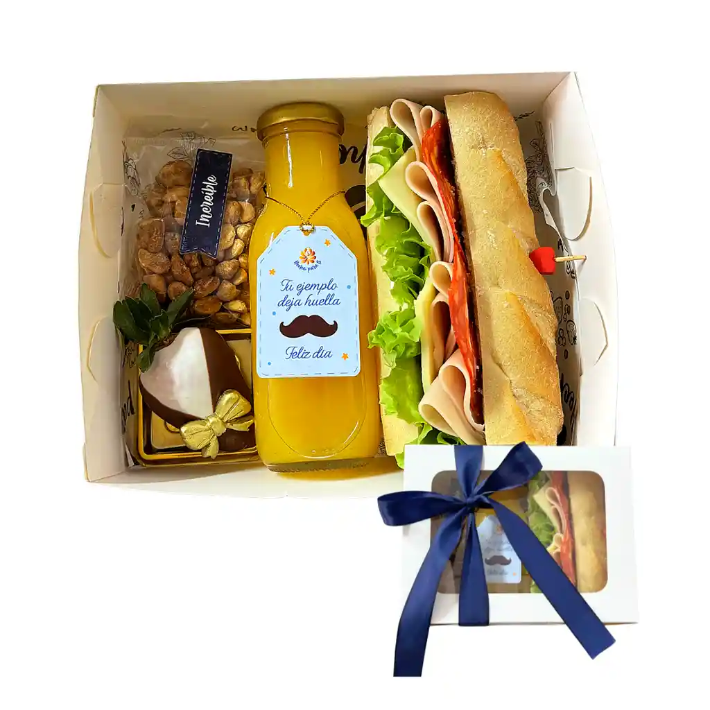 Un detalle delicioso y especial para celebrar a ese hombre que deja huella cada día. Incluye jugo de naranja natural, sándwich artesanal en pan baguette con carnes frías, queso y vegetales frescos, snack de frutos secos y una fresa cubierta con chocolate. Presentado en una elegante caja con tapa y moño decorativo, perfecto para sorprender y comenzar el día con un regalo lleno de sabor. 💙