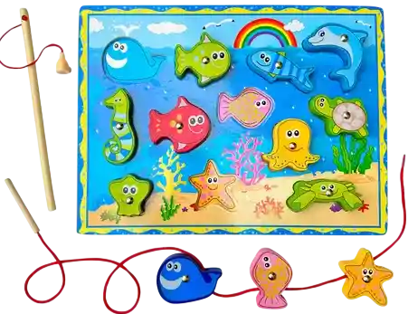 Este set incluye una tabla de madera con formas de animales marinos como peces, tortugas y estrellas de mar, c...Ver más