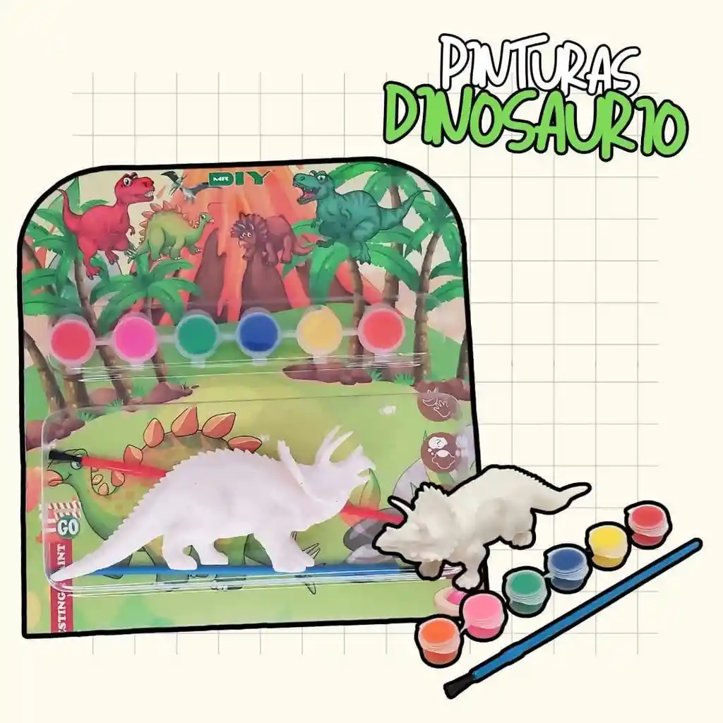 Incluye una figura de dinosaurio de plástico blanco (Tiranosaurio Rex y Triceratops en los ejemplos) y un set de pinturas de colores con pincel. Uso: Diseñado para que los niños pinten y decoren sus propias figuras de dinosaurios, fomentando la creatividad y el aprendizaje sobre estas criaturas prehistóricas.