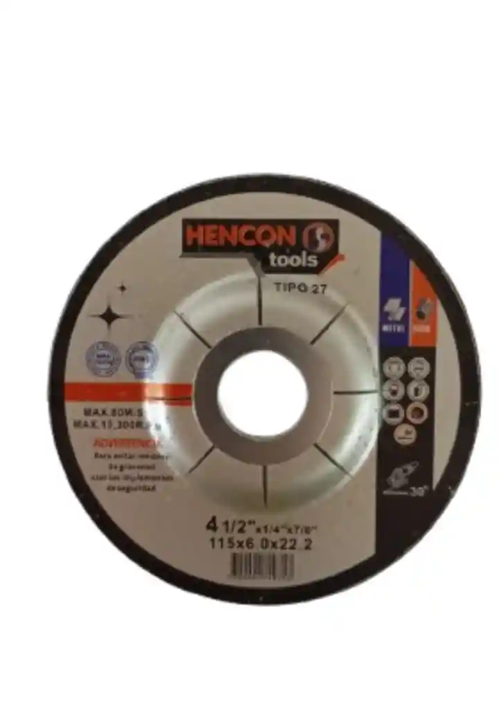 DISCO DE PULIR HENCON 4-1/2" x 1/4" x 7/8" El Disco de Pulir HENCON está diseñado para ofrecer alto rendimiento en trabajos de desbaste, pulido y acabado de metales. Fabricado con abrasivos de alta calidad, proporciona gran resistencia al desgaste, estabilidad y larga vida útil durante el uso. Ideal para trabajos en acero, hierro y metales ferrosos, este disco garantiza eficiencia, control y seguridad en aplicaciones profesionales e industriales. Especificaciones Técnicas Diámetro: 4-1/2" (115 mm) Espesor: 1/4" (6 mm) Orificio central: 7/8" (22.23 mm) Material: Abrasivo de alto rendimiento Aplicación: Pulido, desbaste y acabado de metales Compatibilidad: Amoladoras angulares estándar Dimensiones del producto Largo: 115 mm Ancho: 115 mm Alto (espesor): 6 mm Peso 140 gramos Ventajas ✔ Alta durabilidad ✔ Excelente rendimiento en desbaste ✔ Mayor estabilidad durante el trabajo ✔ Ideal para uso profesional e industrial
